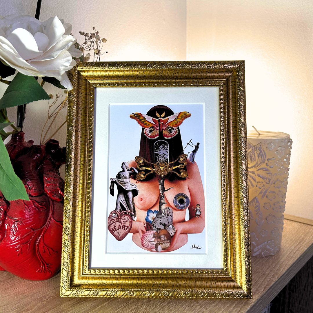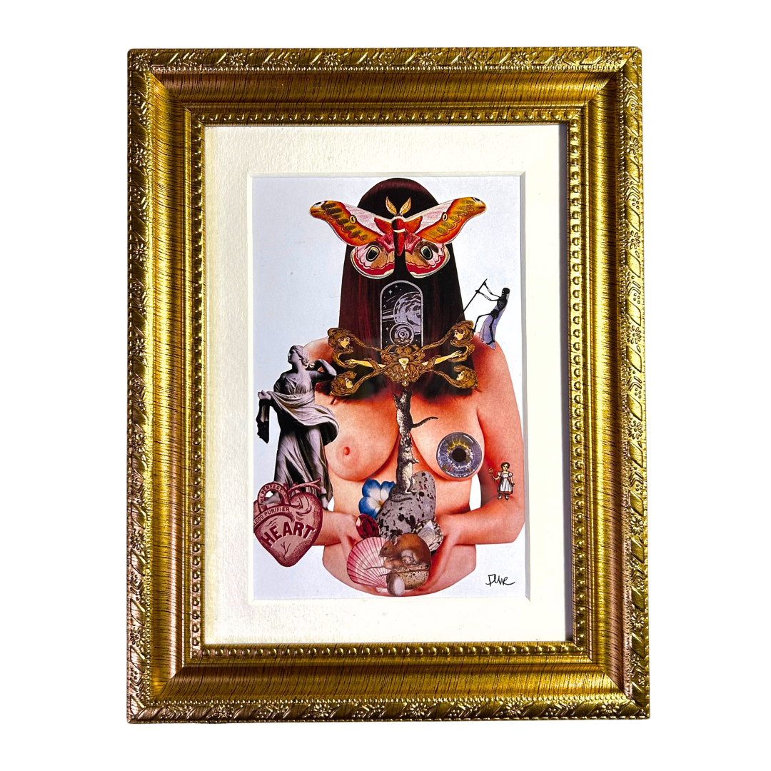 Print del collage análogo Femenil enmarcado en dorado con paspartú.