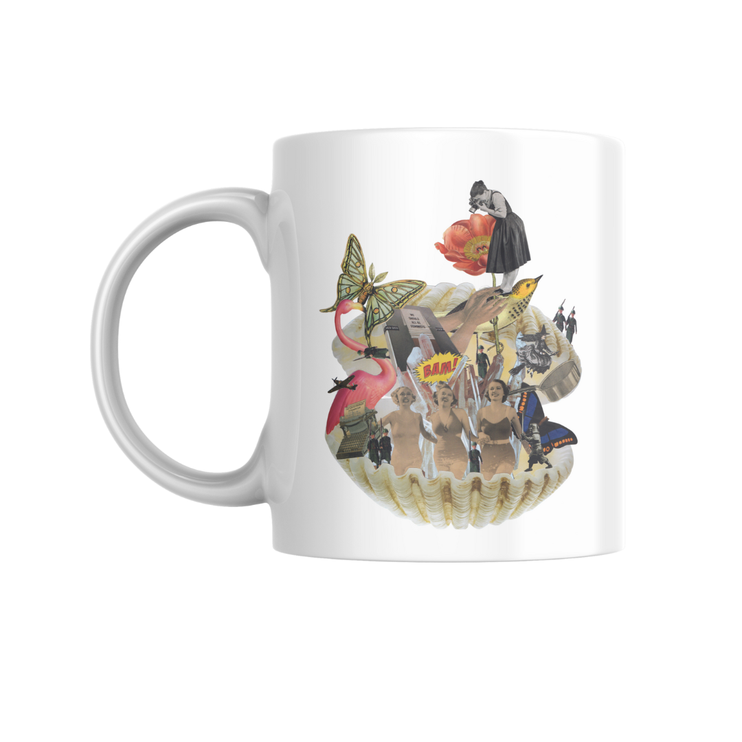 Tazón de 11oz ilustrado con un collage análogo de la eterna guerra feminista.